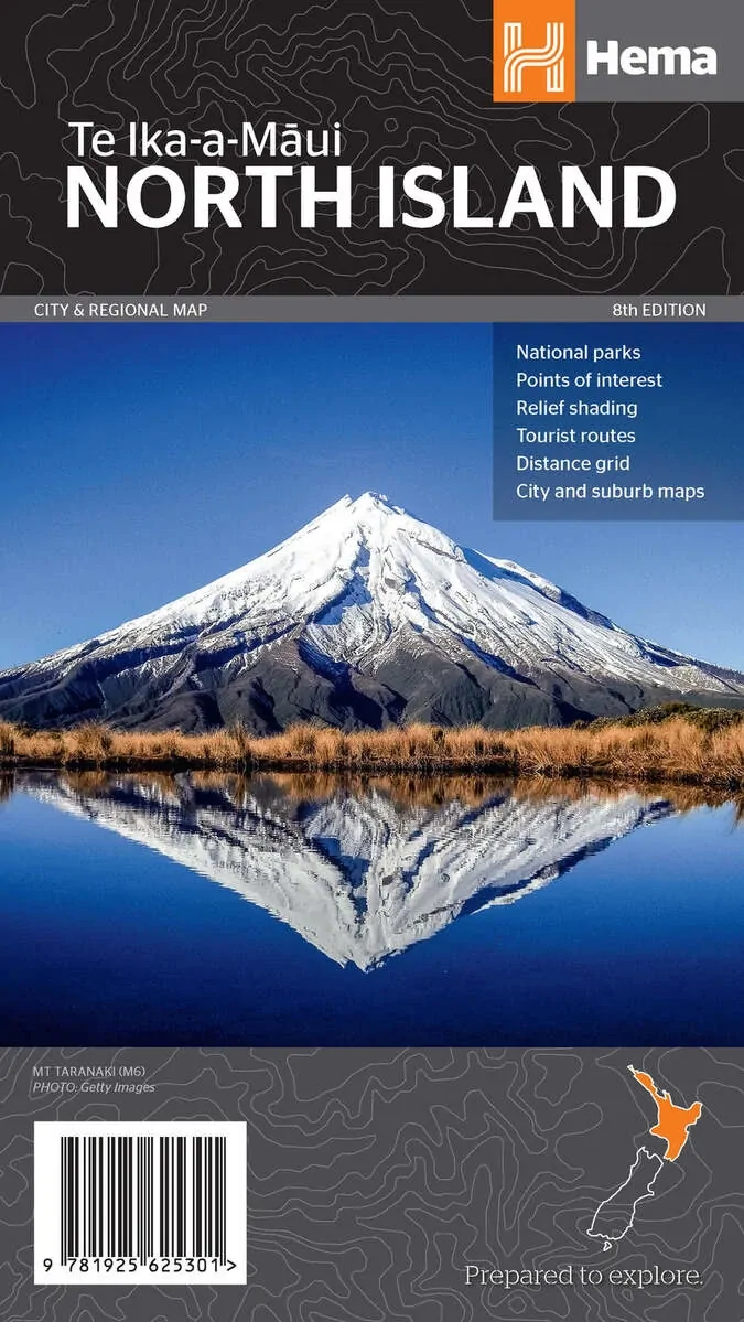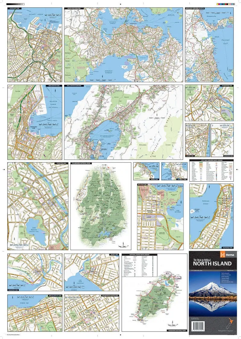 A regional map of the North Island of New Zealand (NZ) at a scale of 1:1,000,000. Marked on the mapping are points of interest, tourist routes, walking tracks and national parks for touring the island. On the reverse are city maps of Auckland, Wellington, Whangarei, Napier, Kerikeri, Hamilton, Gisborne, New Plymouth, Palmerston North, Rotorua, Russell, Paihia and Tauranga, as well as Auckland and Wellington suburbs maps and a map or Te Urewera National Park. Also included is a distance grid.