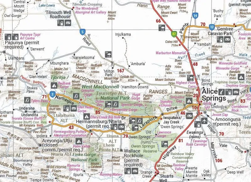 A map of the Northern Territory that features camping and rest areas, 24hour fuel and points of interest. On the reverse are through road maps of Darwin and Alice Springs, a map of the greater Darwin region. For trip planning there is a national park matrix and contact details for information centres.