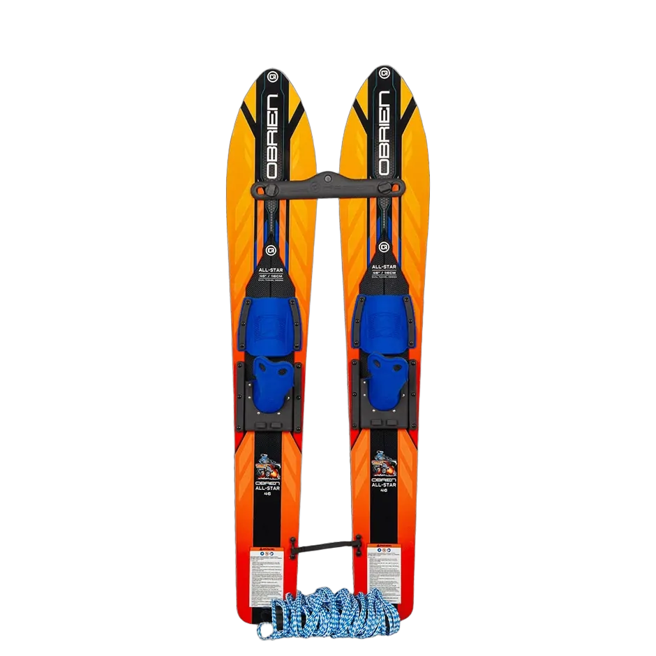 The All-Star Trainers are the ultimate training tool for teaching kids to ski! Featuring a dual tunnel design for a smooth ride, a stabilizer bar that prevents the skis from splitting apart, and the trainer rope and handle, the All-Stars have everything you need to simplify the learning process and turn your kids into waterskiers!