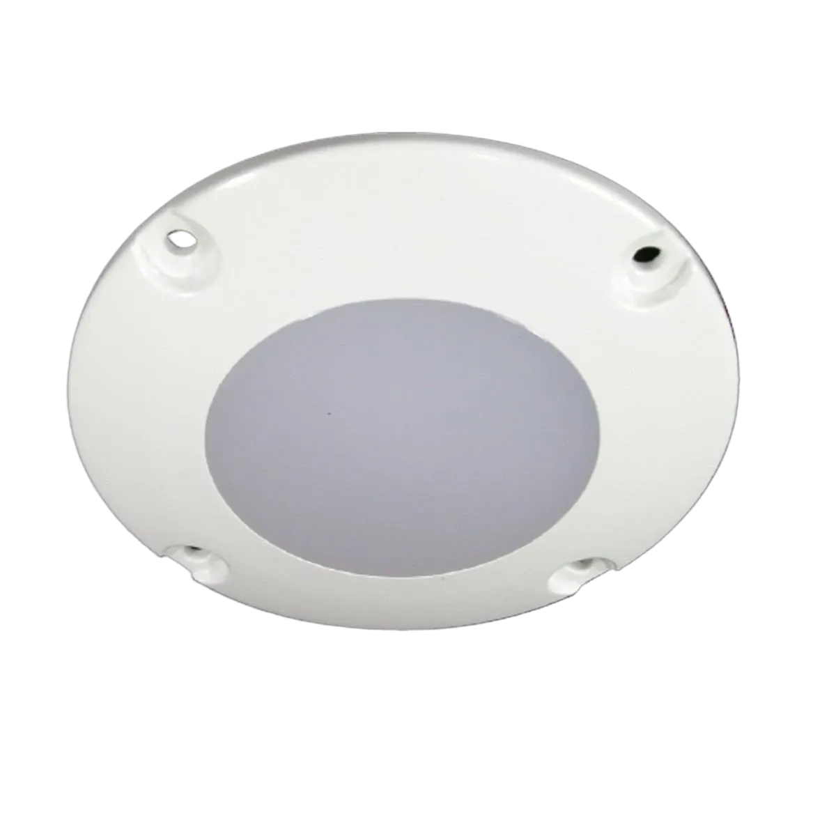 Suitable for both interior and exterior use. Low profile, flush mounting for original equipment look. White trim with opaque lens. High impact polycarbonate construction. Convex lens moulded into flange provides maximum strength and waterproofing. Wide caulking flange for assured water tightness. Brass bulb contacts. 12 volt, 7 watt incandescent bulb.