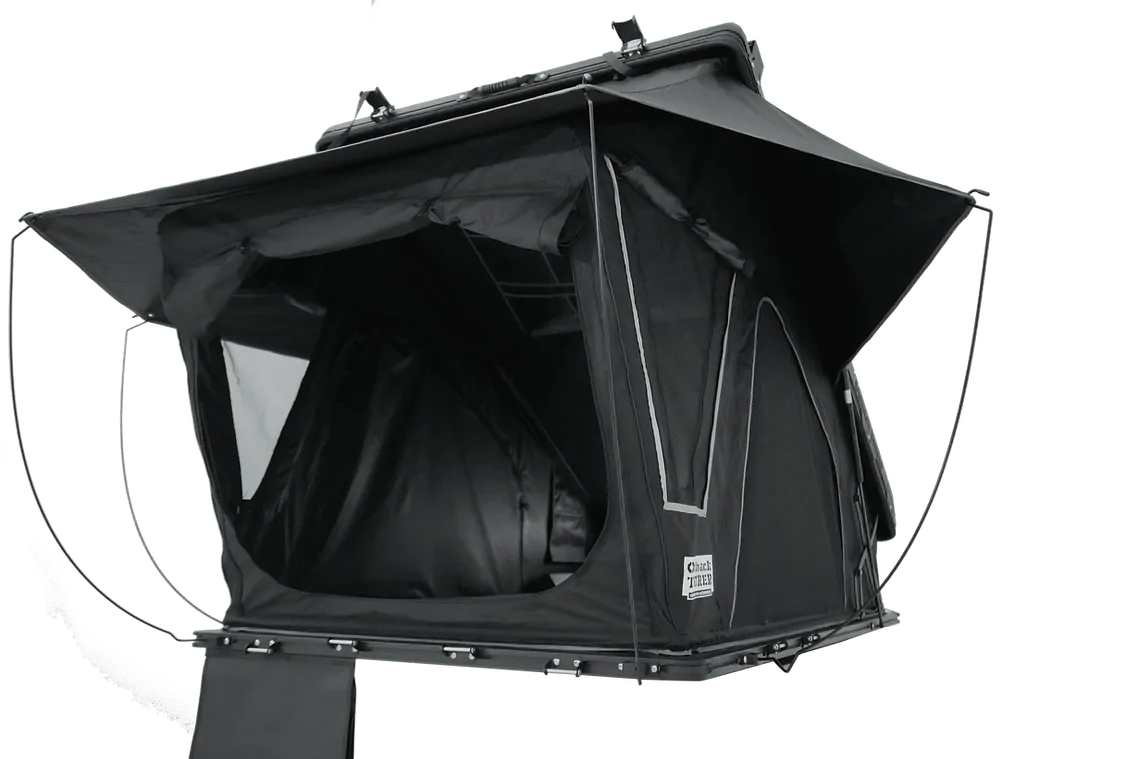 But that's not all our tents come fully equipped with roof rails and solar panels for maximum convenience. Setting up camp has never been easier, as our heavy-duty gas struts allow you to open the tent in seconds. And with a telescopic ladder measuring 2.3m, all it takes is a simple unlatch and push to enjoy your cosy nights sleep.