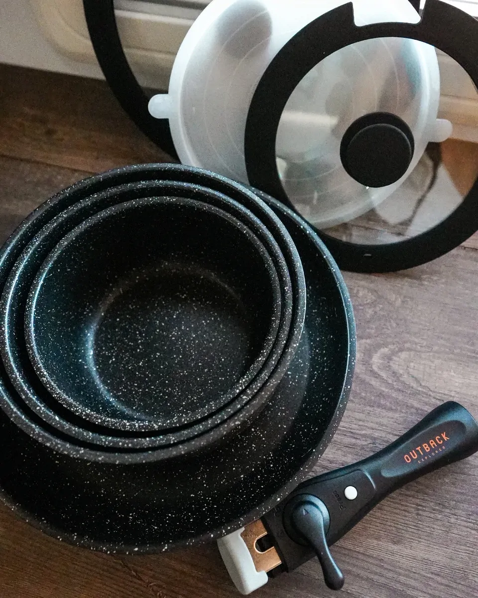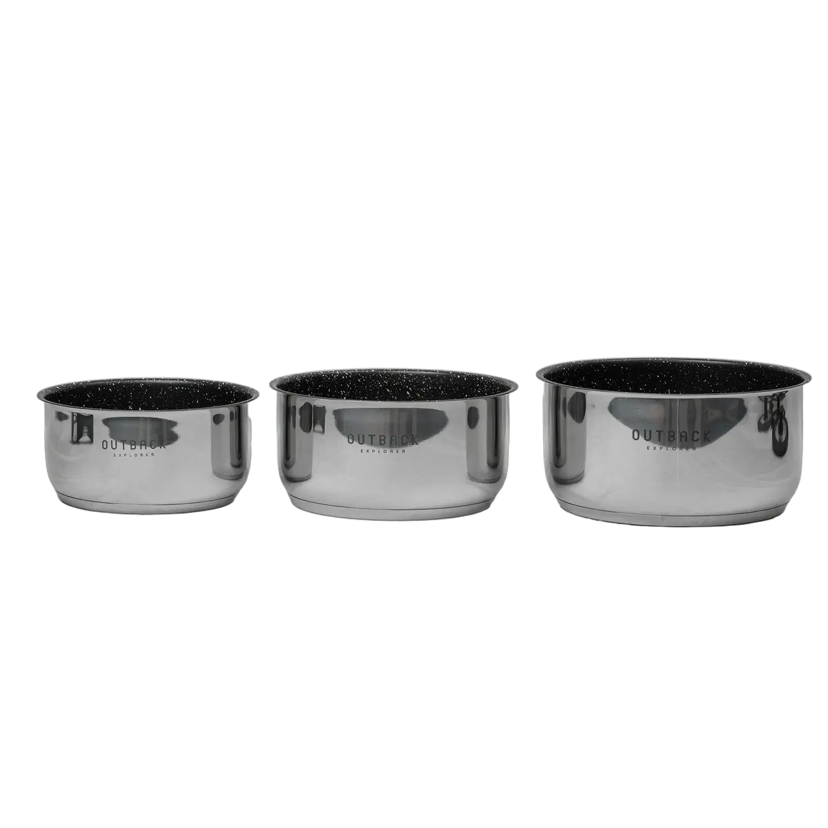 Yes, Outback Explorer stainless steel non-stick pots are built with a five-layer induction base. They’re fully compatible with gas, electric, and induction cooktops, making them a smart choice for caravanners using smaller burners or portable stoves around the fire.