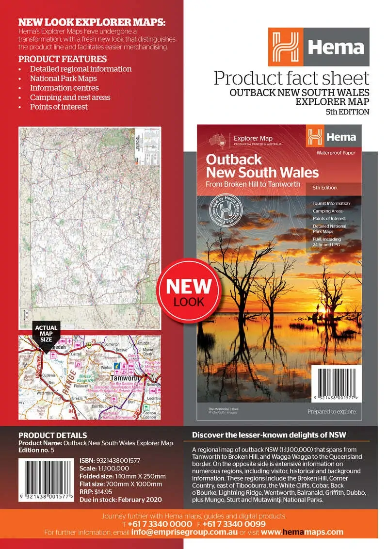 A regional map of outback NSW (1:1,100,000) that ranges from Tamworth in the east to Broken Hill in the west, as well as from Wagga Wagga in the south to past the Queensland border in the north. On the opposite side is extensive information on numerous regions, including visitor, historical and background information. Covered regions include the Broken Hill region, Corner Country, east of Tibooburra, the White Cliffs region, Cobar and surrounds, around Back o'Bourke, Lightning ridge and surrounds, Wentworth region, Balranald, Griffith region, Dubbo and surrounds, Kinchega National Park, Mungo National Park, Sturt National Park and Mutawintji National Park.