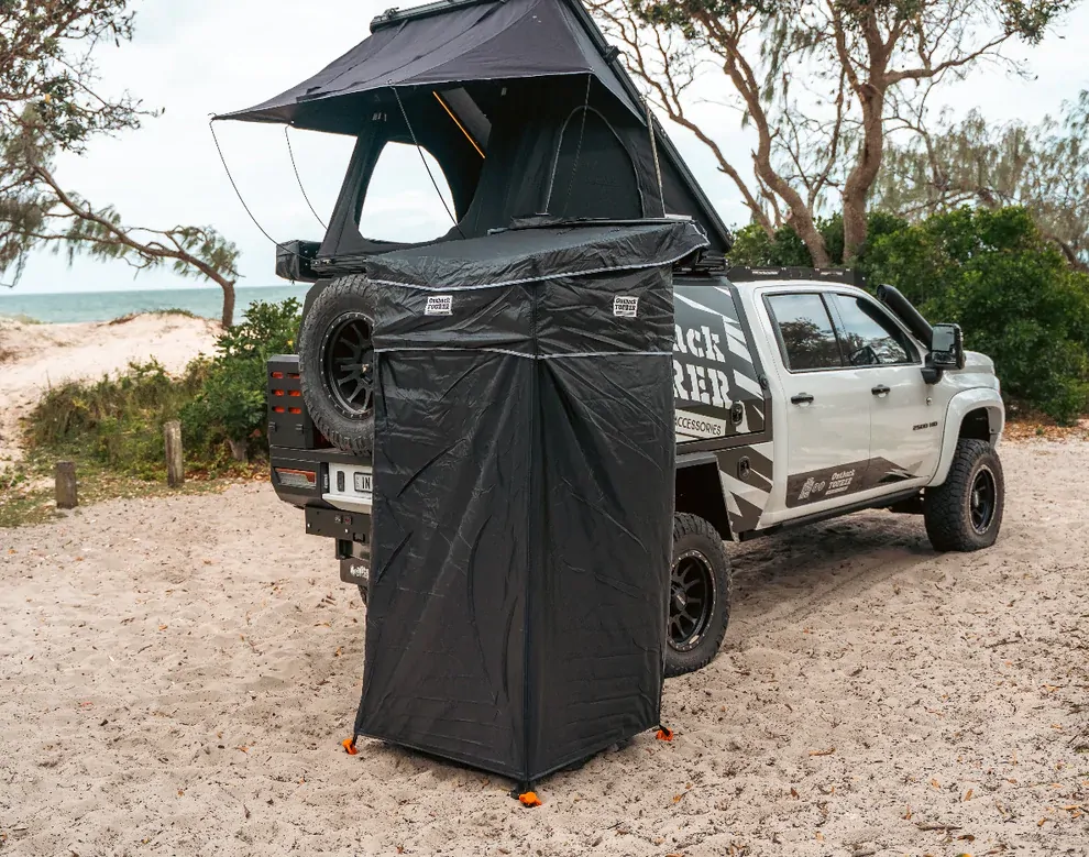 Made locally in Victoria, this kit is designed specifically for the Outback Tourer Shower Awning. It features a gas strut-assisted design for smooth operation and a quick-release latch for easy setup and takedown. With 105mm hole centre spacing, it ensures a secure fit, and all necessary mounting hardware is included for hassle-free installation.
