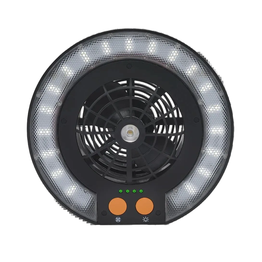 The OZTENT LED Fan Light is a 3-speed fan with multiple lighting functions and USB charge port. Light settings are - spotlight, ring-light lamp and mosquito repellent. Its lightweight design makes it easy to carry, hang or stand. Perfect for keeping your shelter cool and condensation low.