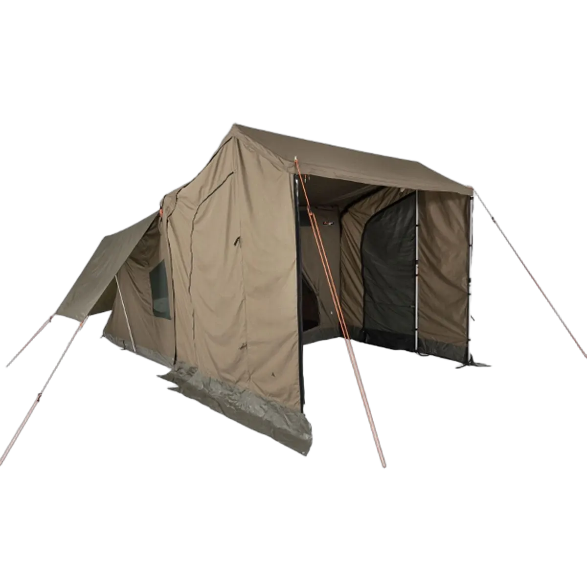They simply and easily zip to the awning and side of the tent. They are made from the same waterproof Ripstop Polycotton Canvas as the tent. The Peaked Side Panels also have a zippered canvas door and a zippered superfine mesh screen door in each side.