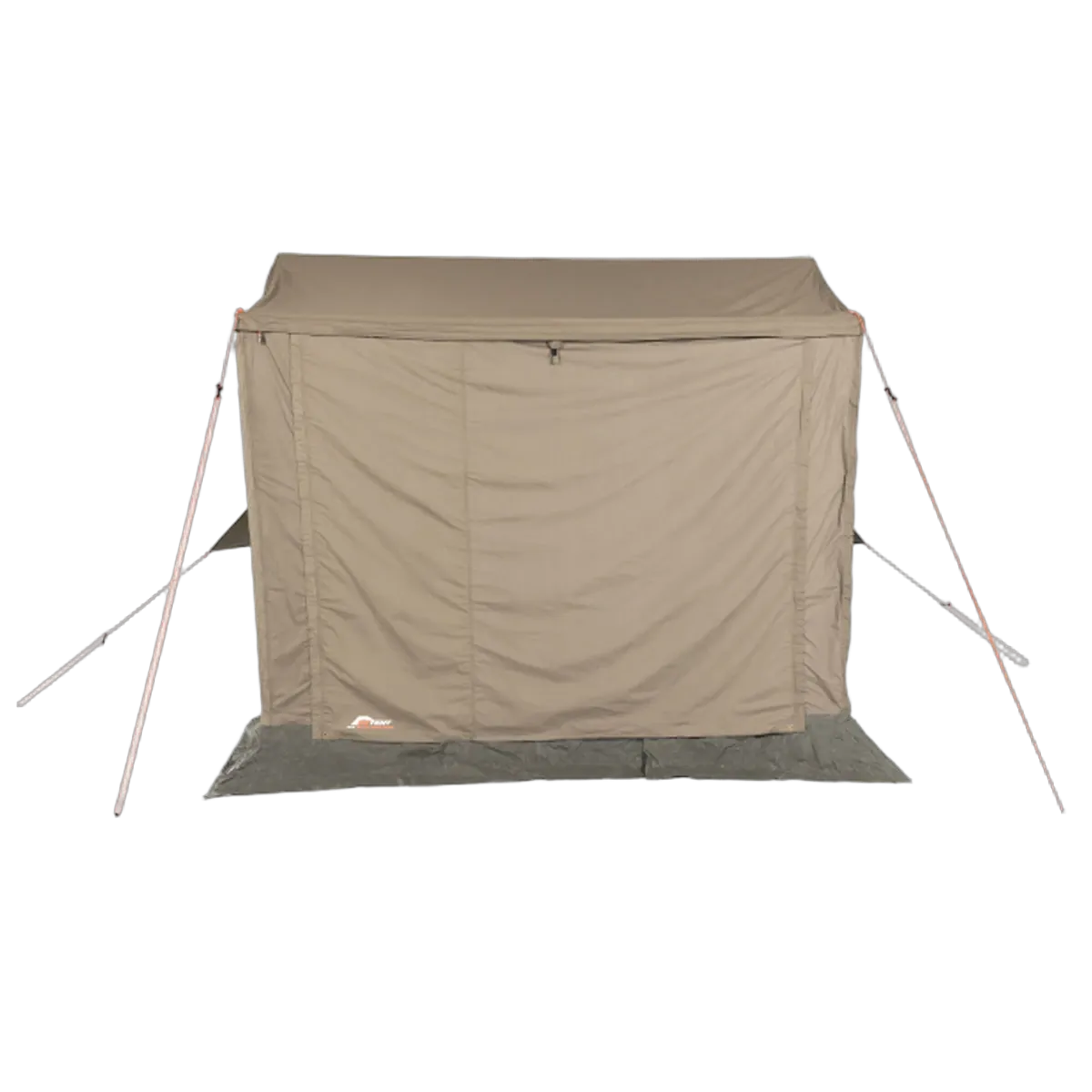 This panel has a large screened area with a zippered door made from superfine mesh. It also has a drop-down zippered canvas panel if it rains. This drop-down panel can also be used as an extra awning with the use of extra poles (poles not included).