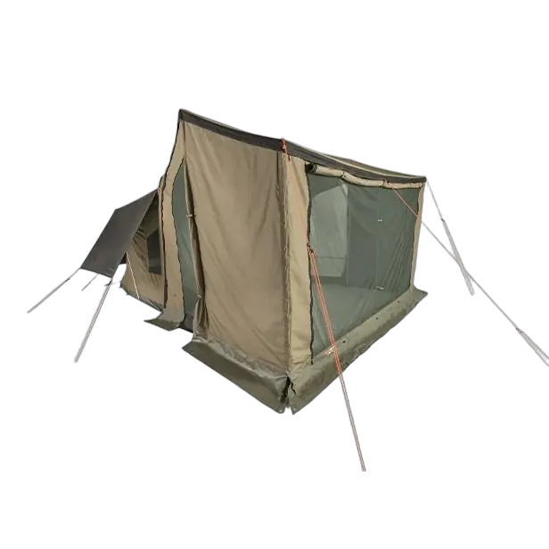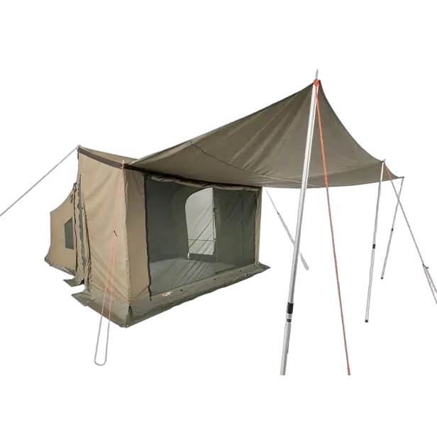The OZTENT SV-5 Max Front Panel allows you to completely close in your awning when used in conjunction with the optional Peaked Side Panels. It simply zips to the front of the awning. This panel has a large screened area with a zippered door made from No-See-Um mesh. It also has a drop-down zippered canvas panel for when it rains.