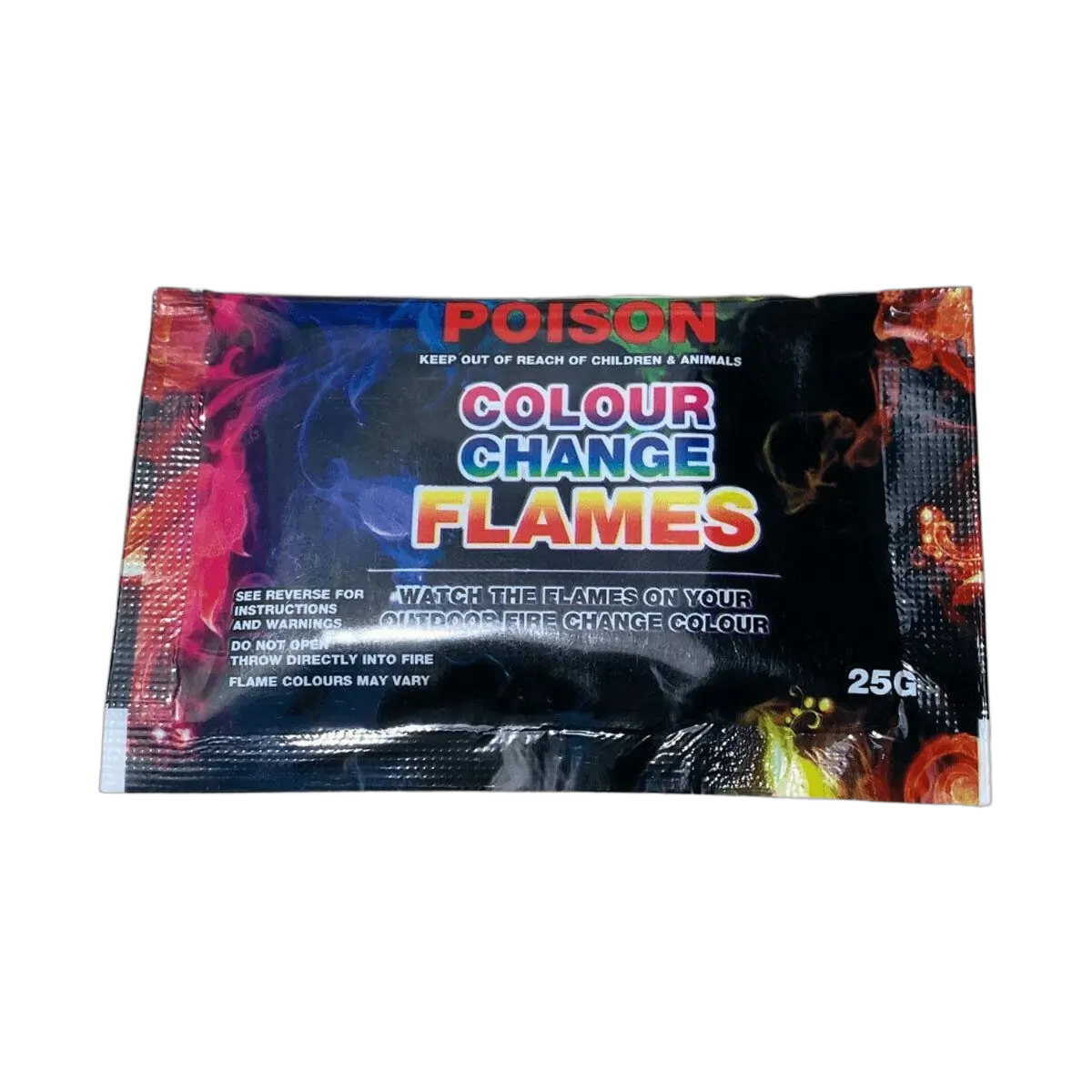 Simply throw a pack or two into your open fire and create an awesome display of coloured flames. The long lasting colours run from pink and purple, to green, blue , orange, yellow and turquoise. It amazes the kids, delights your friends and soothes your senses while you sit by the fire in peace.