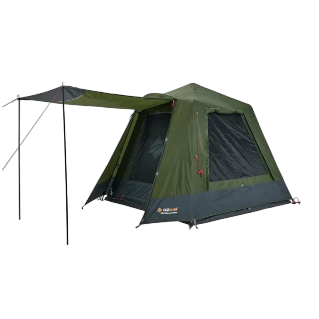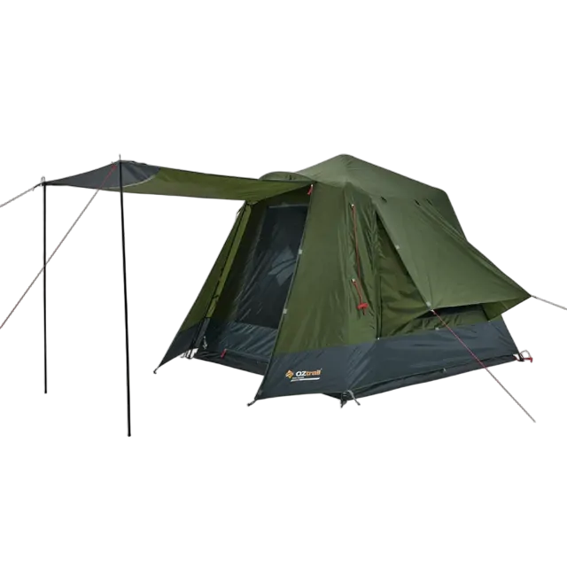The Fast Frame 4P tent by OZtrail is an ideal single-room tent for couples and their gear. With our Fast Frame® system, this tent sets up in minutes without hassle. The large gusseted windows ensure excellent airflow, reduce condensation, and can be pegged out in bad weather while still providing ventilation. The front vestibule area features an easy-to-install brow pole, providing extra headroom for easier access when entering and exiting the tent. Stay dry and protected from the elements with the durable 150D flysheet boasting a 1500mm waterhead rating and a heavy-duty PE floor. The inner tent includes No-See-Um Mesh panels for ventilation and insect protection, along with zippered screens for privacy in busy campsites. Power cables can be safely brought into the tent with the zippered PowerPort™ access point. The tent packs down into an oversized, easy-to-stuff carry bag with compression straps for a compact pack size.