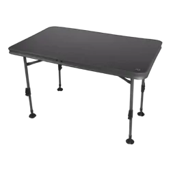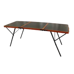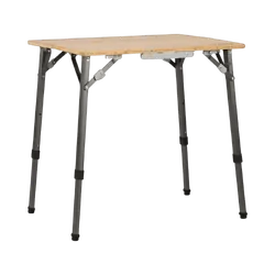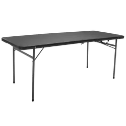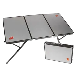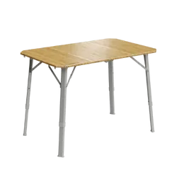 Compact folding tables with multiple height settings for dining and food preparation.