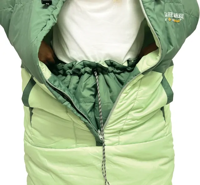 - Easy transformation: close zips and bottom drawstring for a sleeping bag, open for chilling, or pull the bottom up around your waist and cinch it for walking.