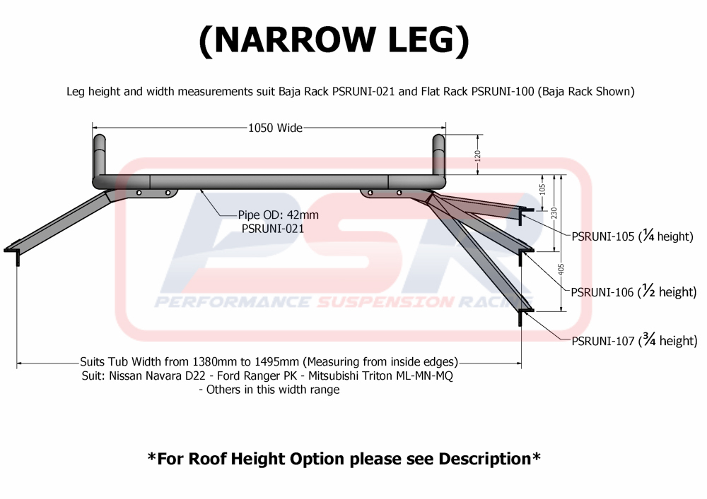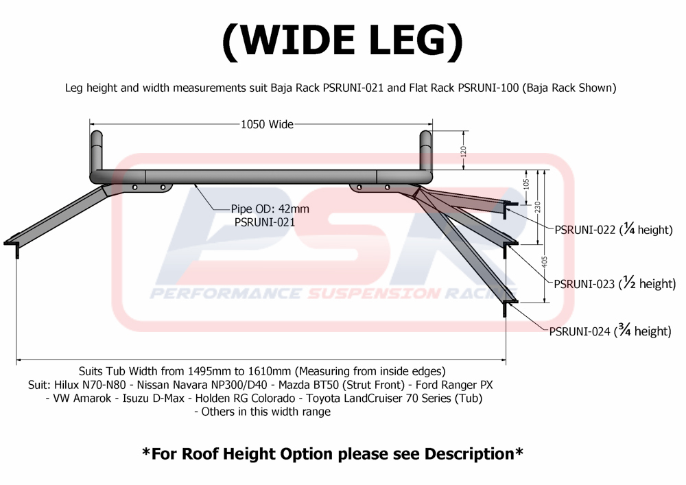 This kit is supplied with PSRUNI-028 Roof Height Baja Rack Leg Set of 4 suit Ranger PX, BT50, N80 Hilux (570 Height) to suit your individual vehicle. Racks are powder coated black. Rack basket outside area dimensions are 1050mm(W) X 1400mm(L) X 120mm(H).