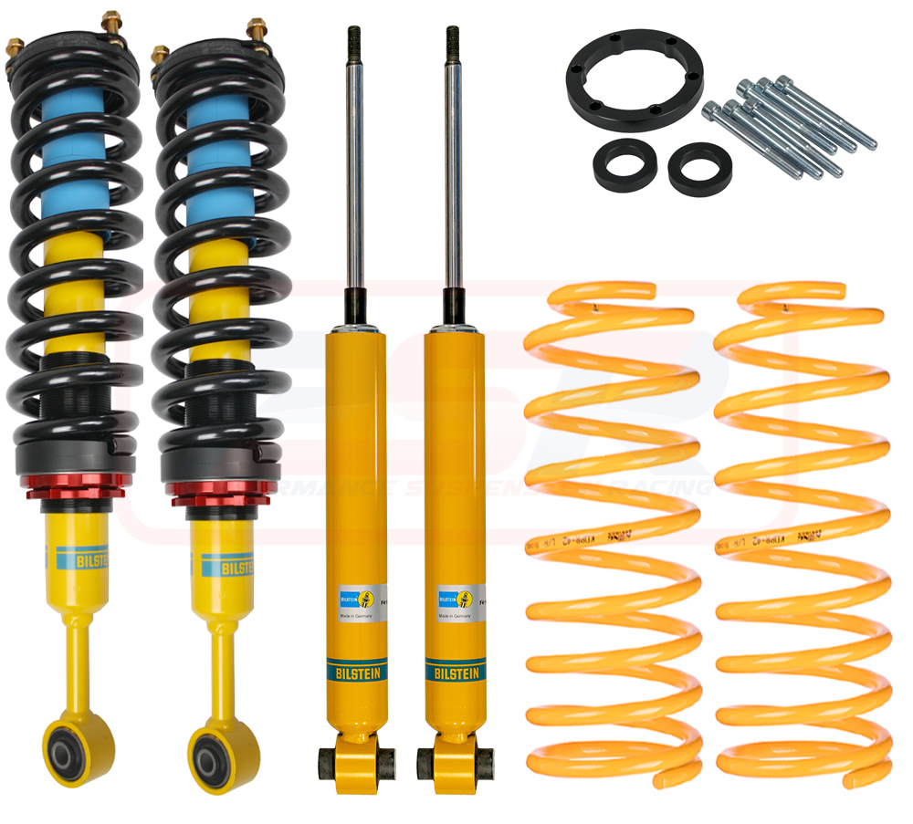 This kit contains PSR Spec Bilstein front adjustable struts all pre-assembled with Kings coil springs and HD strut tops, front tailshaft spacer & packers, Bilstein rear shocks and King Springs rear coils