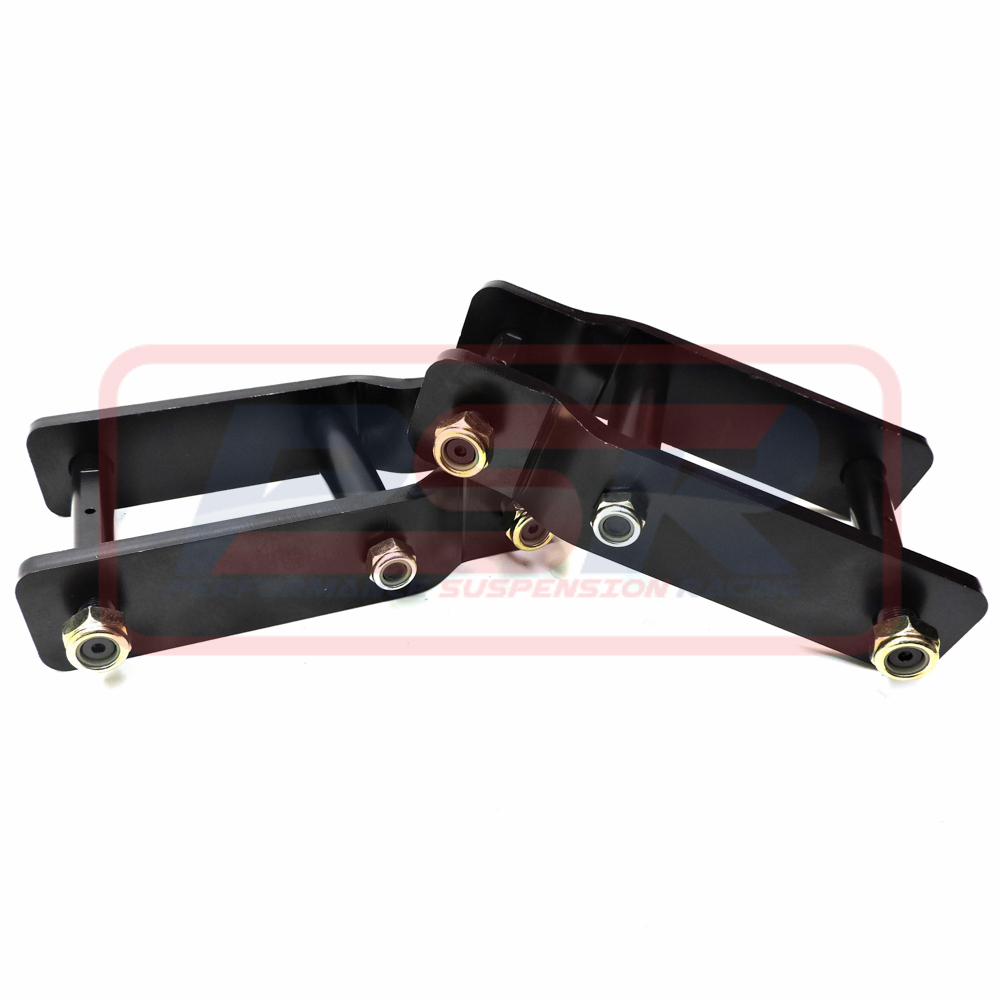 PSR's extended shackle for the strut Front Holden RG Colorado & Isuzu D-MAX models is a super heavy duty leaf spring shackle. Designed to a length that provides 2" of lift it features side plates made from 10mm laser cut steel, CNC machined and welded pins. Pins are greaseable for a long service life. Welded design is far superior to other designs on the market as it reduces shackle walking and flexing under load, other brands are designed around a centre welded support with no outer support where it is needed. Coated Black to blend with the chassis. The factory shackle is only 105mm and severely restricts leaf movement.