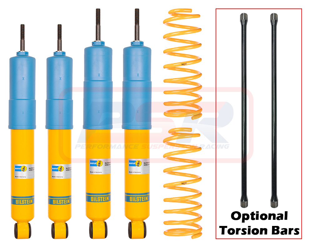This kit contains Bilstein front and rear shocks with King Springs rear coils and optional torsion bars.