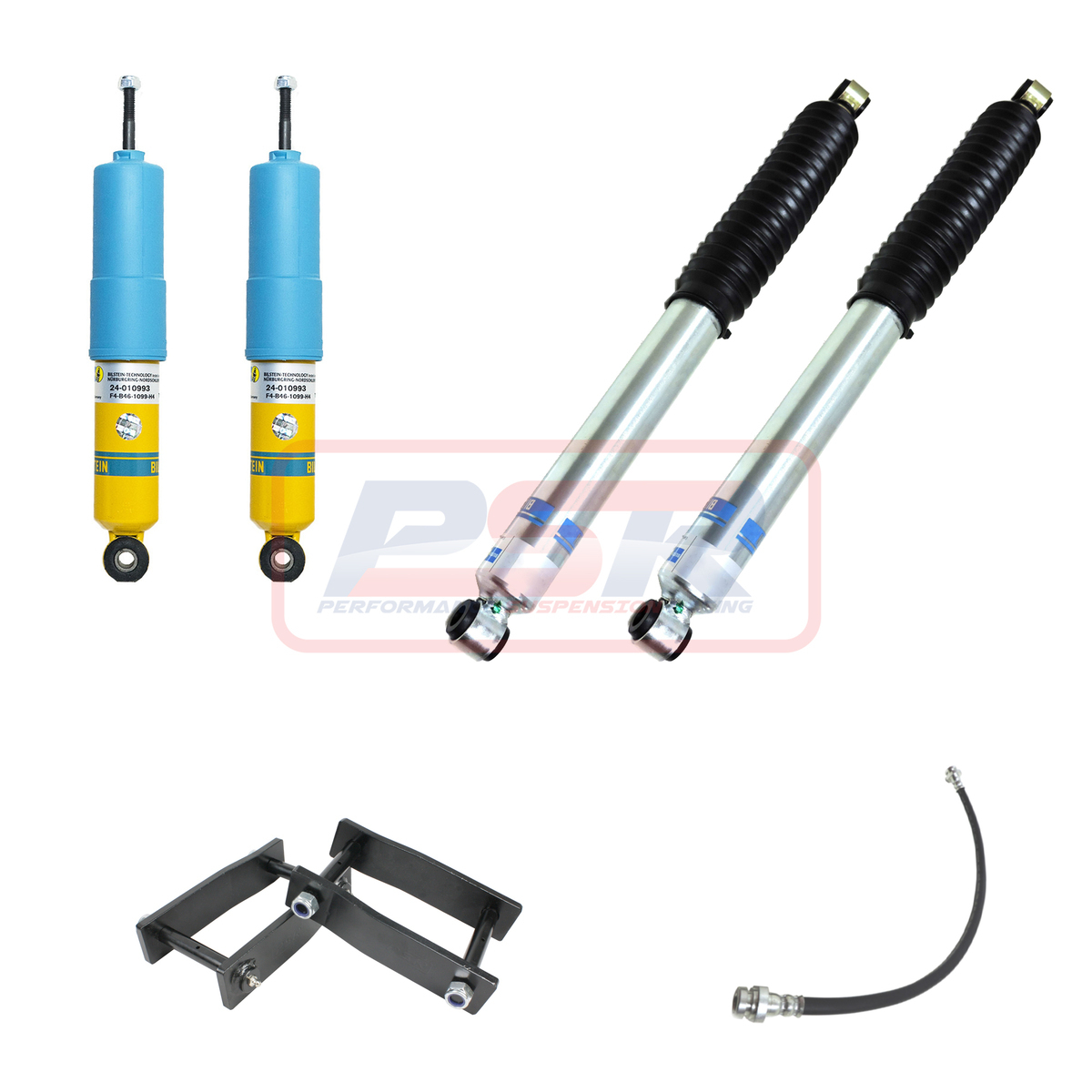 This system sits at 2" front & 1" rear and contains Bilstein front and rear shocks, PSR extended shackles, brake hose and optional torsion bars.