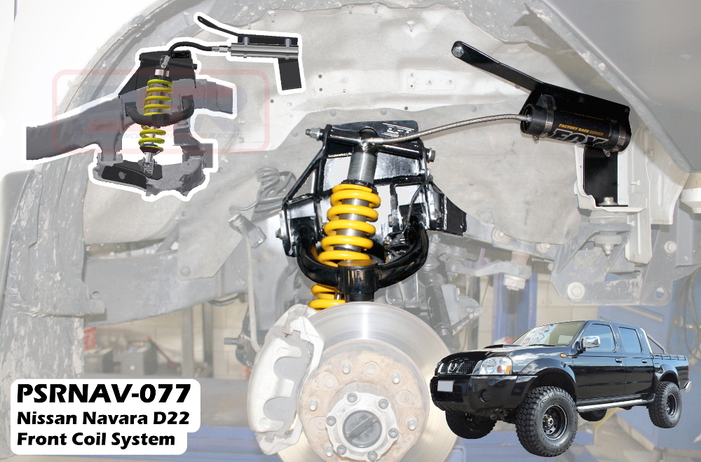 The PSR Nissan Navara D22 Front Coil System is developed to remove the factory torsion bar setup and convert to an integrated coilover allowing height, spring rate and damping adjustability with a major improvement in ride quality while retaining the factory IFS configuration. Supplied with a custom 5" FOX remote reservoir coilover featuring damping adjustability the system comes with a pre welded top tower for ease of installation and all required items to complete fitment.
