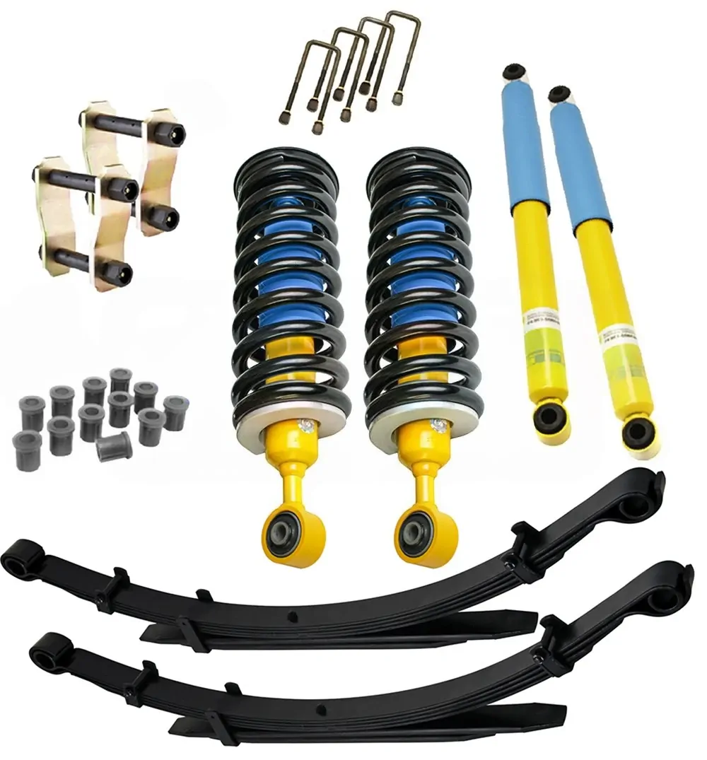 This kit contains Bilstein front struts all pre-assembled with King coil springs and HD strut tops, leaf springs, U-bolts, new leaf bushes, greasable shackles, and Bilstein rear shocks.