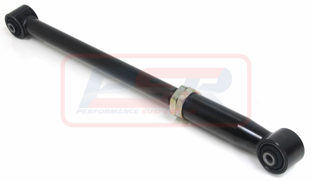 PSR's Nissan Patrol GQ - GU and Maverick adjustable lower arm is a super heavy duty replacement designed to fix two factory issues. These arms allow pinion angle adjustment while providing an arm that is just about indestructible. Featuring 36mm solid bar and is machine MIG welded at both ends to provide ultimate strength. Arm is single adjustable so there is no locking nuts at the diff end to get hooked up on underlying obstacles and features double lock nuts to avoid the arm undoing. The arm is finished in Black to blend with the chassis and comes with new heavy duty rubber bushes. The arms minimum length is 660mm and maximum length is 710mm.