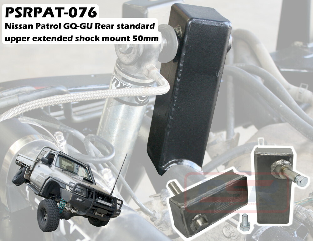 PSR's Nissan Patrol GQ-GU Rear Extended Shock Mounts are a weld on mount that replaces the factory location on the chassis. This is an area which can greatly improve the rear suspension through modified mounting heights to suit different shock lengths, achieving desired travel of your rear suspension. Depending on requirements both the diff and the chassis mounts can be modified.