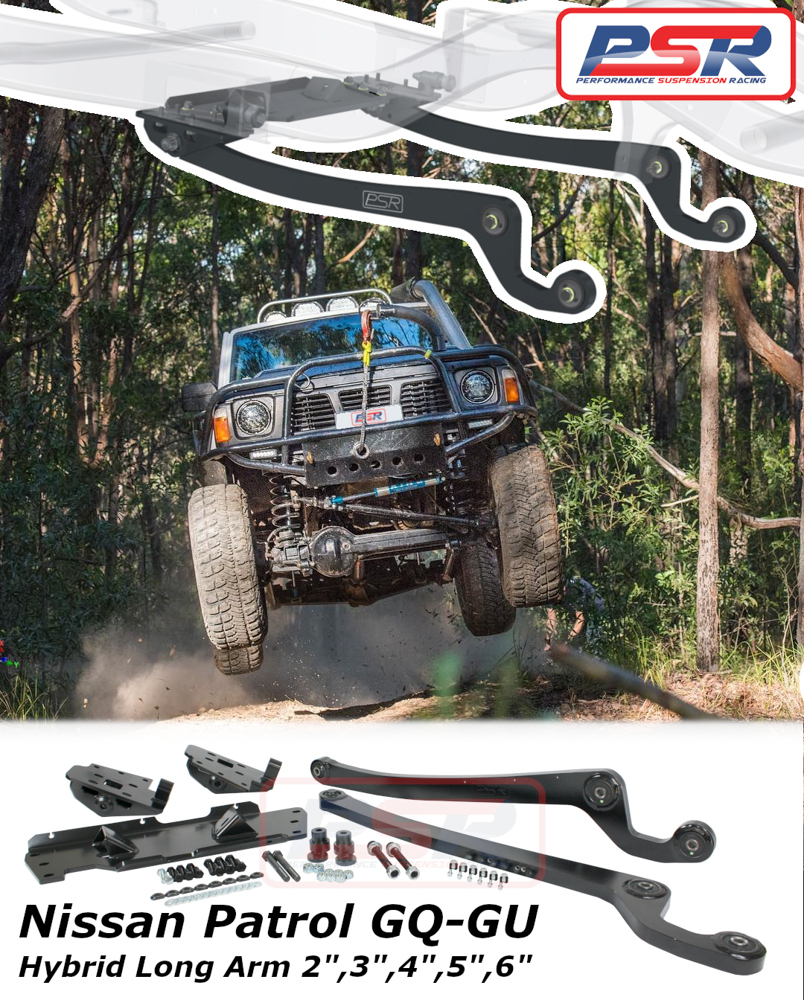 PSR's Nissan Patrol GQ-GU Hybrid Long arm system is a heavy duty improved design radius arm system. It is designed to offer the best combination of stability and off road performance! Starting with the radius arms, they are manufactured from 32mm high strength plate and are the longest on the market, featuring full wrap bush housings at the front and a Toyota Landcruiser rear bush allowing reduced restriction of articulation and extended bush life, genuine bushes are installed throughout.