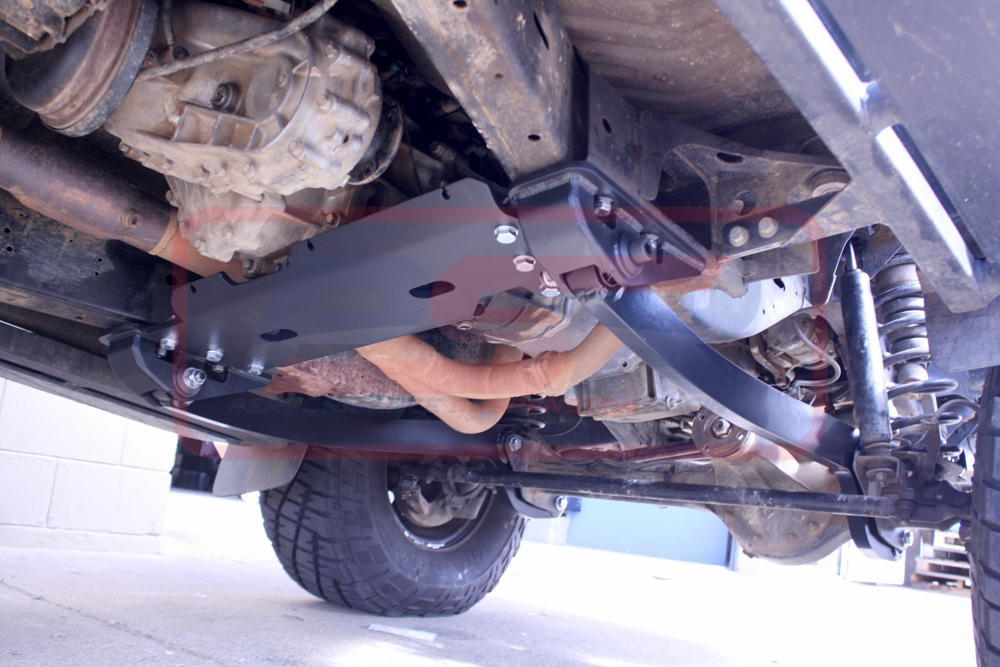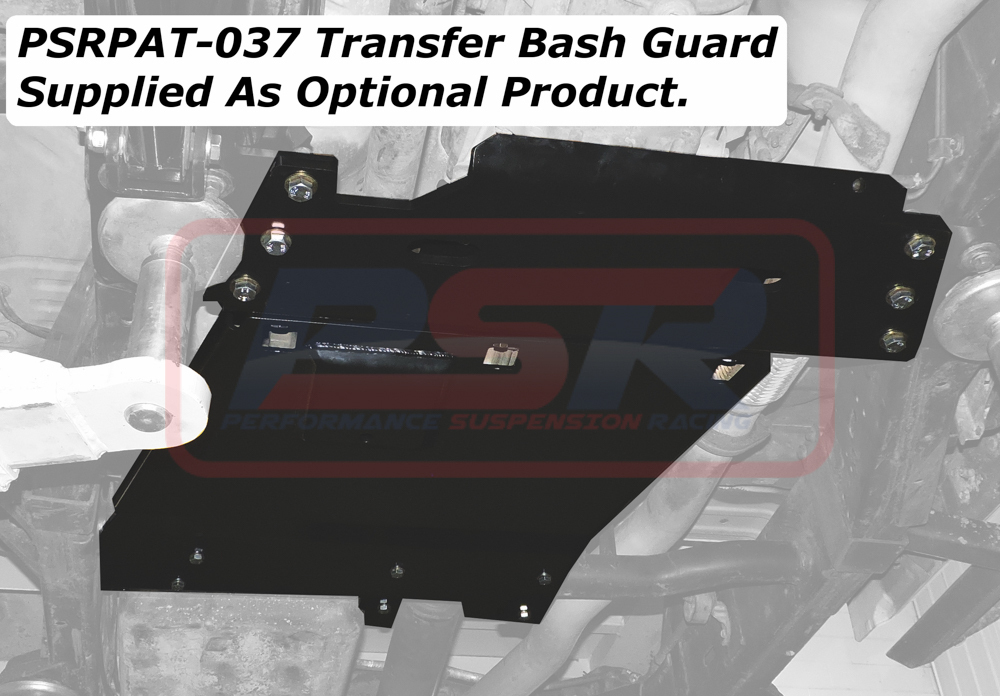A super heavy duty replacement gearbox X-member is supplied which is fabricated from 12mm plate and offers higher clearance and reduced catch points compared to the factory X-member. This allows the use of our Heavy Duty bash guard that protects the transfer case and other items under the vehicle (P/NO, PSRPAT-037). All components are manufactured using strict welding certification practices and are powder coated black for a stealth look.