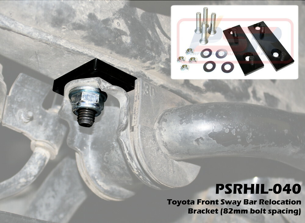 PSR's Toyota Prado 120/150/FJ Cruiser front sway bar relocation system is designed to allow more clearance from the sway bar to the strut assembly and are 100% bolt-in. Unlike other brands our kit features countersunk bolts and press in studs to reduce the thickness of the main plate meaning the possibility for contact between the sway bar and the radiator supports is eliminate, or only minor. Supplied with studs pre pressed into the plate for easy installation and removal they are E-coated Black and come with all required components to install. Mounting bolt centers are 82mm.