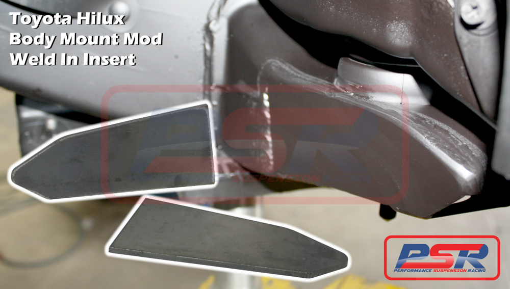 PSR's N70 body mount mod weld in insert is a 4mm flat steel piece that is shaped to suit the removal of all the material on the front side of the front body mount to allow maximum clearance on full lock with larger wheels. Once material is removed then it is as simple as welding in this plate to provide a clean finished mount that does not look modified. Supplied as a pair. For N80 Hilux please see PSRHIL-068