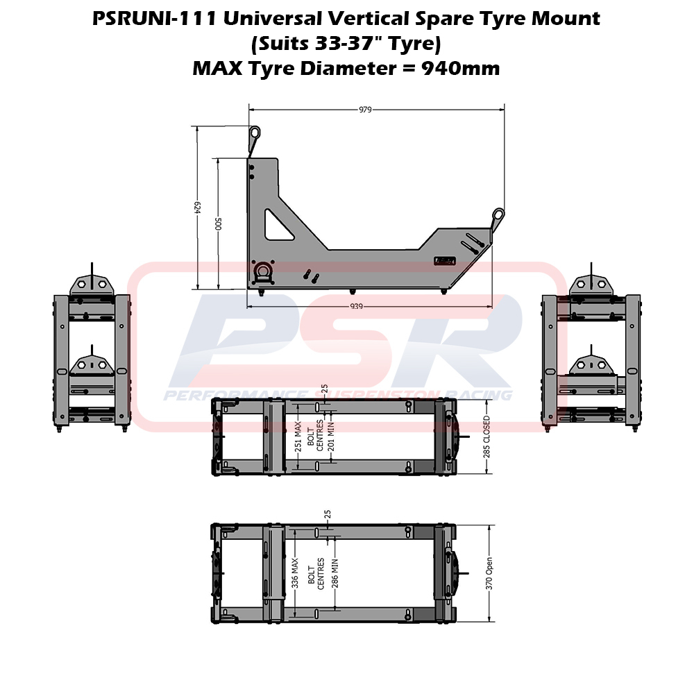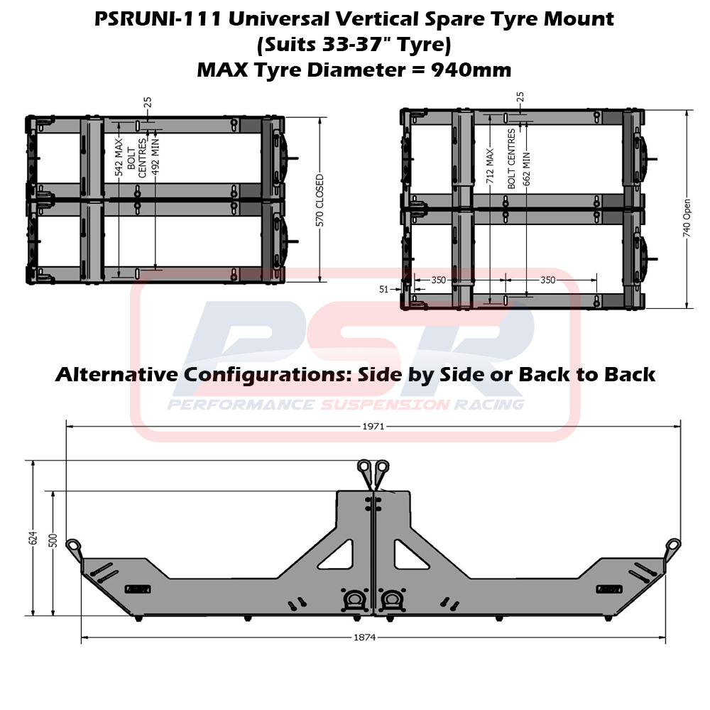PSR's Universal Vertical Spare Tyre Mount comes with two variations to suit tyres from 28-32" and 33-37".