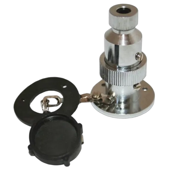 Chrome plated brass screw apart electrical plug & sockets with base seal, retainer chain and socket cover.