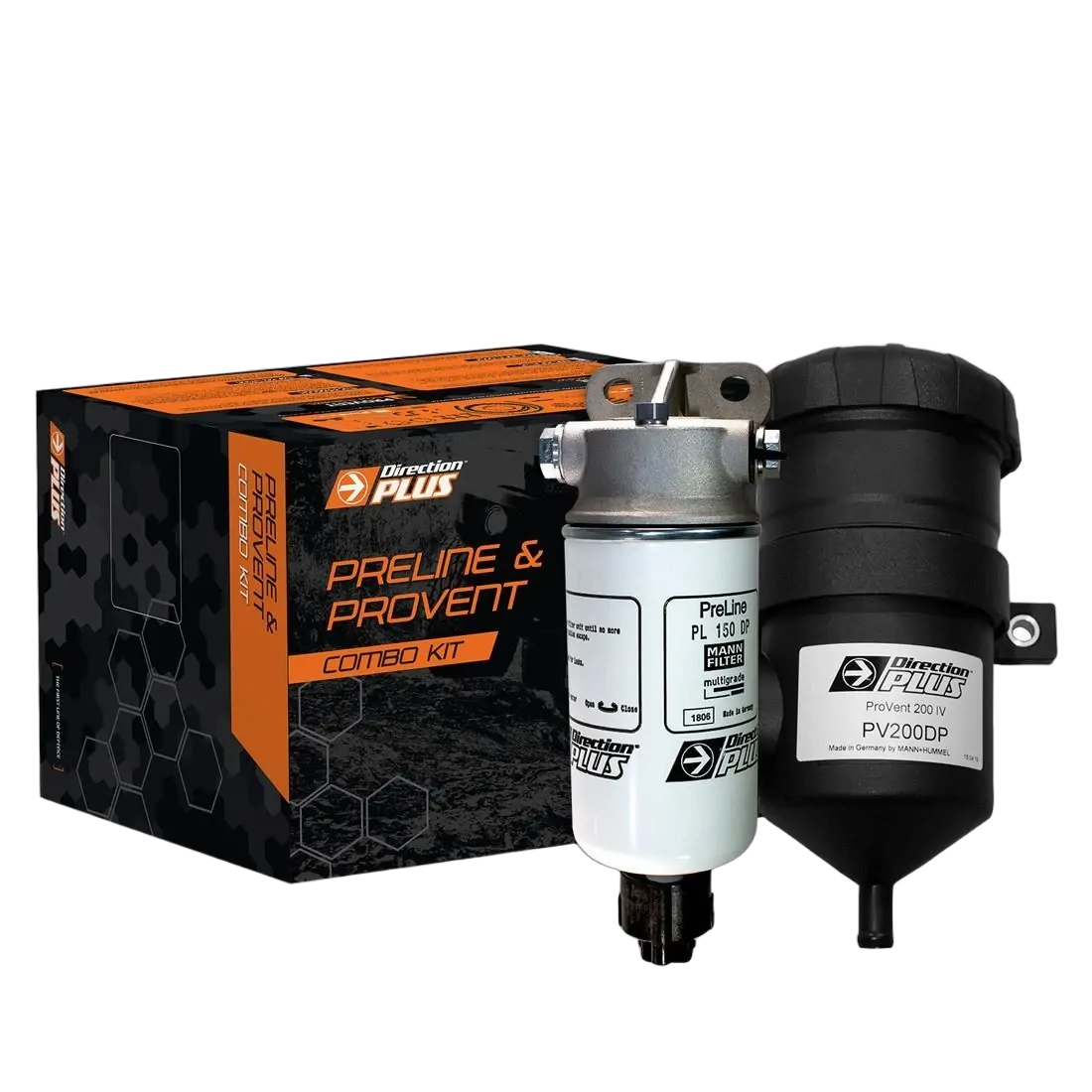 Protect your diesel engine with Direction-Plus™ PreLine-Plus Pre-Filter + Provent Ultimate Catch Can Combo Kit. This is the Ultimate Defence against water contamination, costly injector failure, carbon build-up and reduced performance. Our PreLine-Plus offers up 100% water separation efficiency* and our Provent Catch Can offers up to a massive 98% oil separation efficiency. With this dual kit you can‘t go wrong!