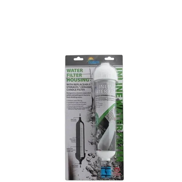 Water filter housing with replaceable Sterasyl® ceramic candle filter, designed to remove suspended solids and pathogenic bacteria from drinking water.