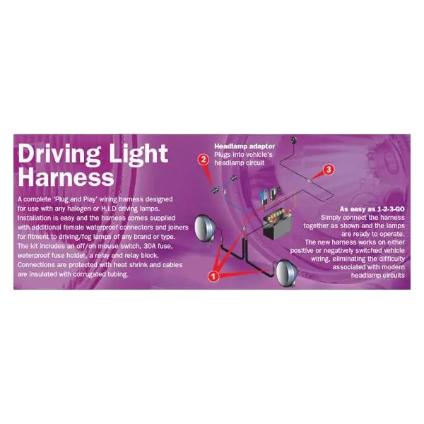 A complete 'Plug& Play' wiring harness designed for use with any halogen or H.I.D dribing lights.