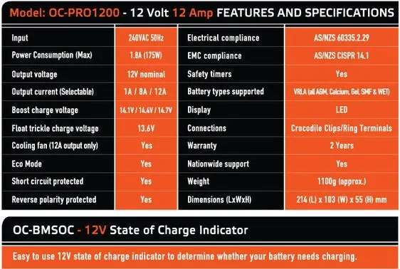 The charger OC-PRO1200 Battery Charger and Maintainer is designed for lead-acid sealed batteries (Calcium, AGM, Gel & Wet) from 3Ah to 240Ah. The charger can also be used to maintain batteries up to 360Ah.