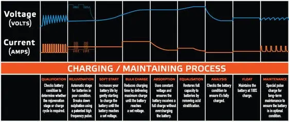 Multi Stage: 1 - Qualification - Battery condition check 2 - Battery rejuvenation (recondition mode) 3 - Soft start charging 4 - Bulk charging 5 - Absorption charging 6 - Equalisation charging 7 - Battery analysis 8 - Float mode 9 - Long term maintenance pulse charge
