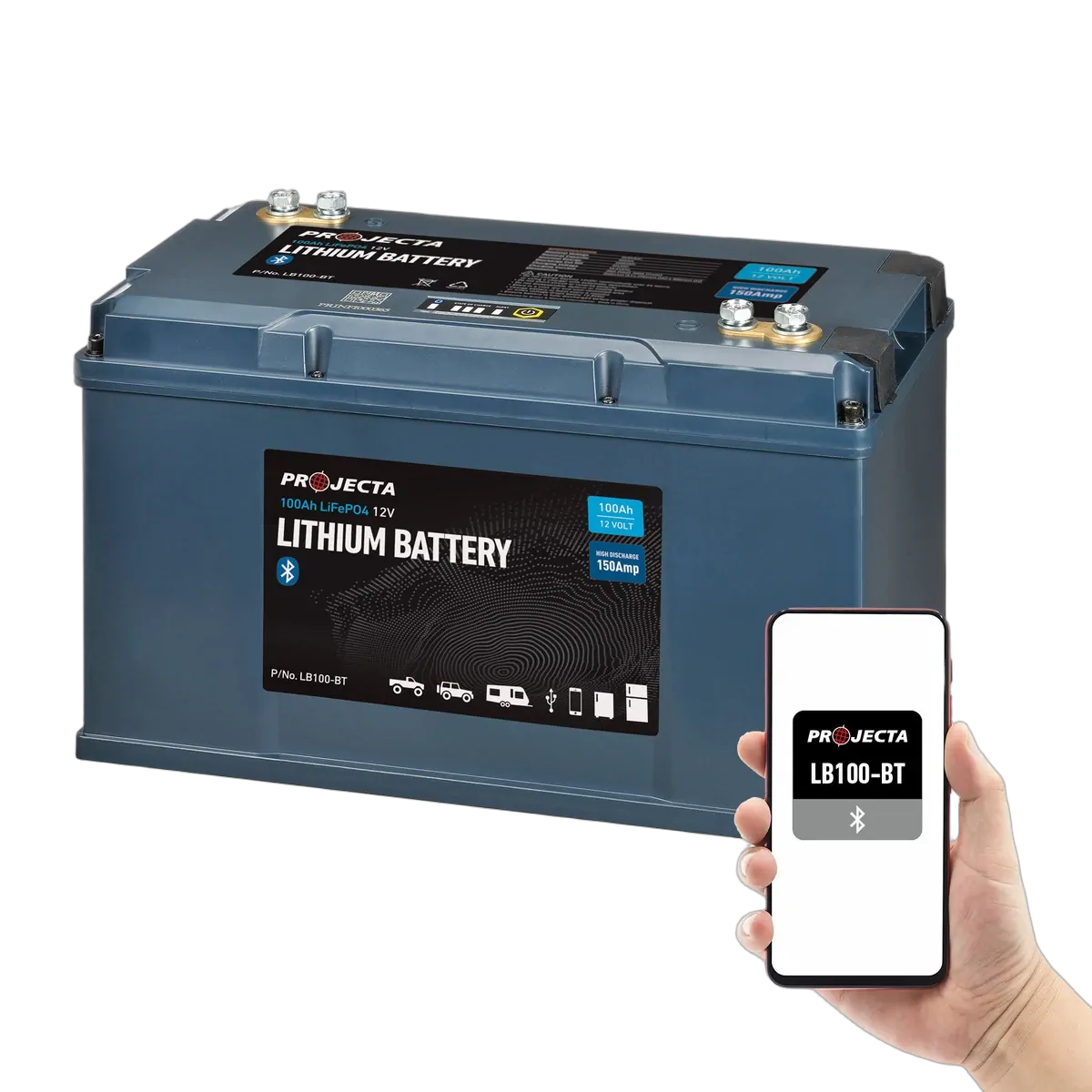 The LB100-BT is the perfect battery for high-power demands in 4WDs and caravans. With an impressive 150A High discharge functionality in a traditional N70 size casing, it delivers exceptional performance. Monitor battery status via smart devices with built-in intelligent battery monitoring. Power 2000W inverters with the 150Ah discharge current. Twin M8 bolts allow easy paralleling of accessories. Enjoy durability with our 5-year warranty. Convenient LEDs provide state of charge, warning indicator, and Bluetooth connectivity, at your fingertips.