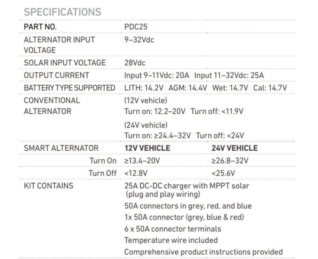 The PDC25 converts your vehicle's 12VDC/24VDC alternator power or Solar power to the required voltage level allowing your batteries to be fully charged, prolonging battery life.
