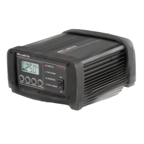 deal for workshop environments, this powerful charger features protective rubber moulded end caps for superior durability. It offers all the features of its standard 25A counterpart without the remote control and temperature compensation probe.
