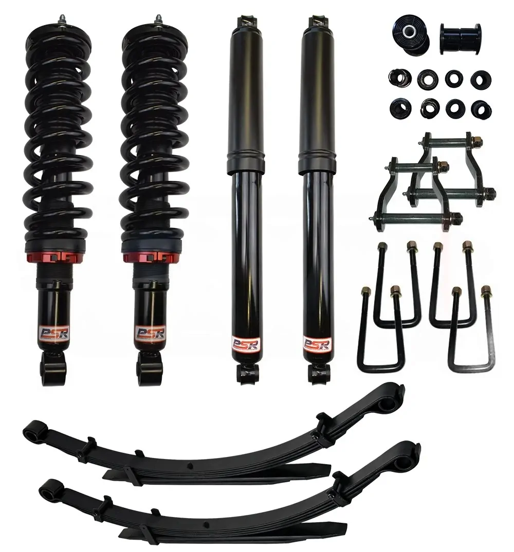 This kit contains PSR TTG front struts all pre-assembled with Kings Coil springs and HD strut tops, leaf springs, U-bolts, new leaf bushes and PSR TTG rear shocks.