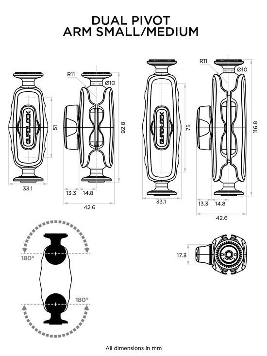Choose between a small (51mm / 2") or medium (75mm / 3") in length Dual Pivot Arm to suit your needs. Both arms are compatible with all Quad Lock 360 HEAD and BASES.