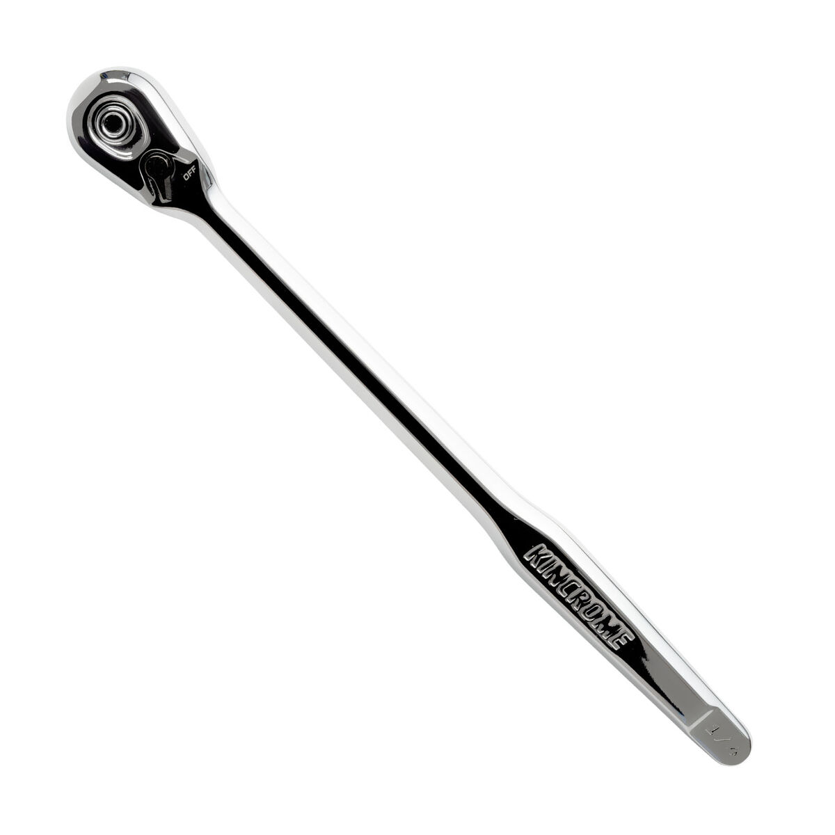 Discover Kincrome’s exclusive, 100% Australian-designed ratchet range—unique to Kincrome and the Australian market—crafted from premium Chrome Vanadium steel with a sleek Chrome Mirror finish and featuring an upgraded 90-tooth ratcheting mechanism for ultra-fine 4° swing adjustments; choose between quick-release button or sealed head designs, benefit from easy end-stop drive-size stamping for instant identification, and find the perfect fit in stubby, standard, long, or extra-long lengths; experience superior ergonomics with the CHOKE GROOVE head for improved grip and a longer swept-handle design for greater leverage, all engineered to meet and exceed DIN standards and proudly designed in Australia for Australian professionals.
