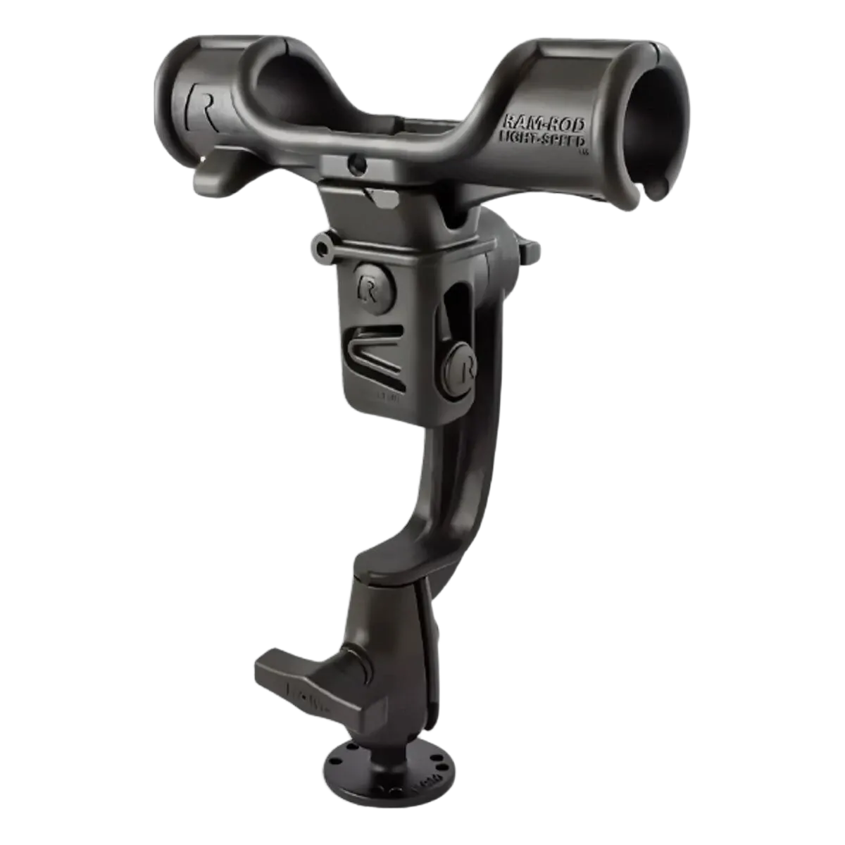 The RAP-370-RBU consists of the RAM ROD® Light-Speed™ fishing rod holder, RAM ROD® Revolution ratchet arm with single open socket and 63mm diameter round base that contains the universal AMPS hole pattern. Offering the patented RAM rubber ball, socket and ratcheting feature, you can rotate the rod holder 360 degrees, while tilting the rod holder forward and back for the optimum fishing angle. . The RAM ROD® Light-Speed™ is another innovative Product in RAM’s long list of high quality, industry leading fishing Products. Ideally suited for spinning reels and bait casting reels, the Light-Speed rod holder provides smooth action when inserting and removing the fishing rod, yet holds firm in rough water or while trolling. The spring loaded design enables rapid removal of the rod and reel when a fish is on, and offers easy placement of the rod in the rod holder.