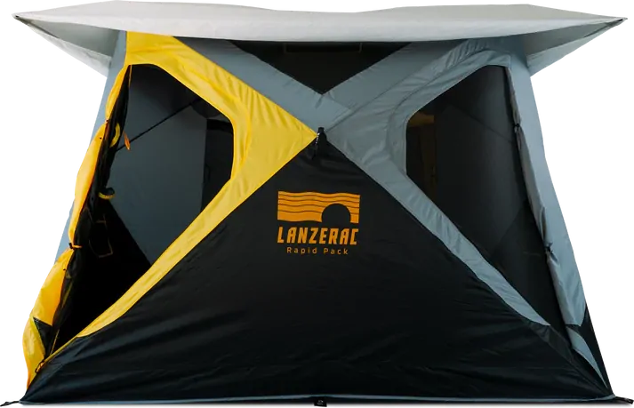 Access and windows: 2 triangle doors with insect screens, helpfully outlined in yellow for easy set-up orientation, 2 large triangle windows with insect screens, 2 higher triangle windows with insect screens, 4 ceiling triangle windows with insect screens for ventilation or star-gazing without the fly.