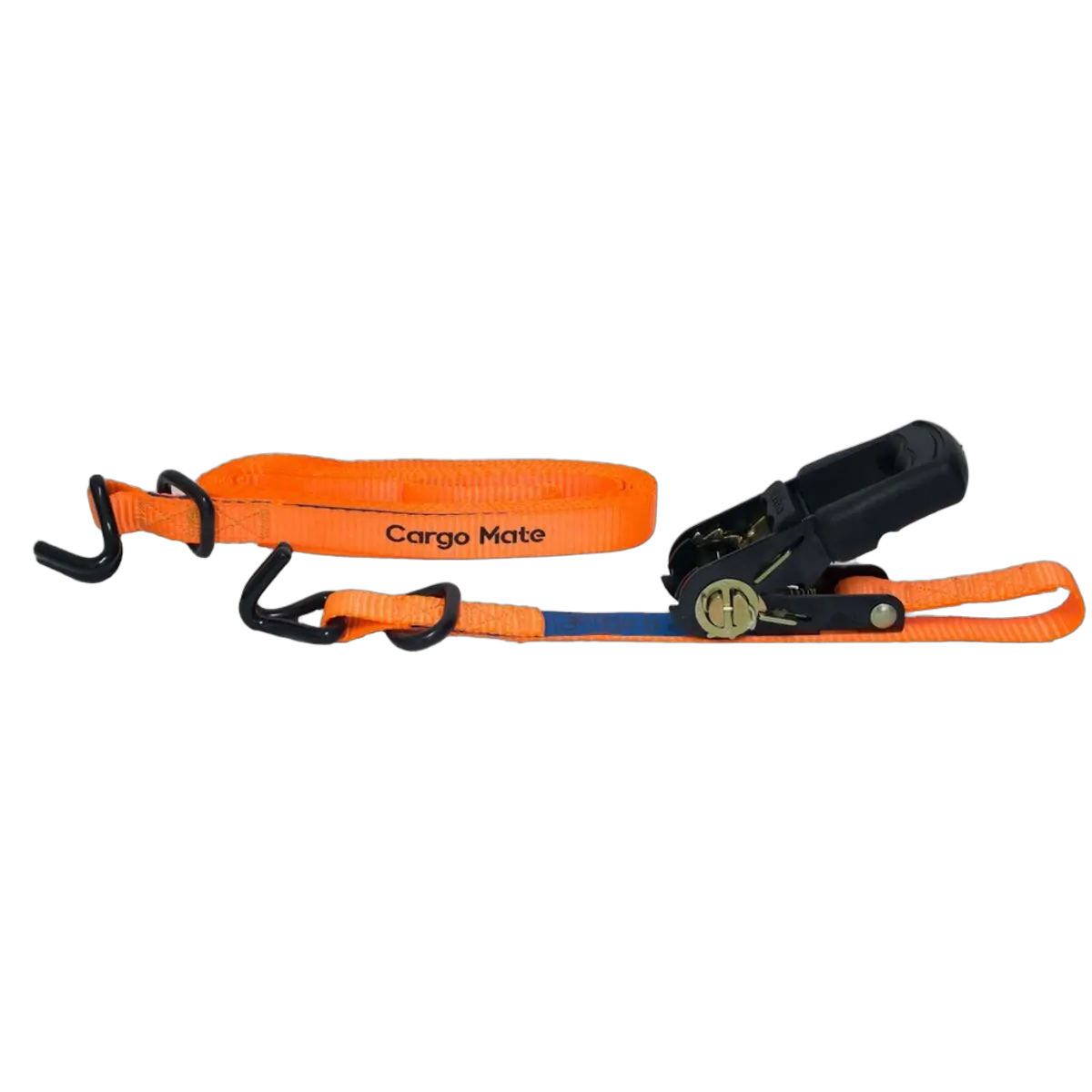 Polypropylene webbing strap features steel hooks with locking D-rings for more load securing options. Large moulded handle provides better grip. Features include automatic locking ratchet action with thumb release.