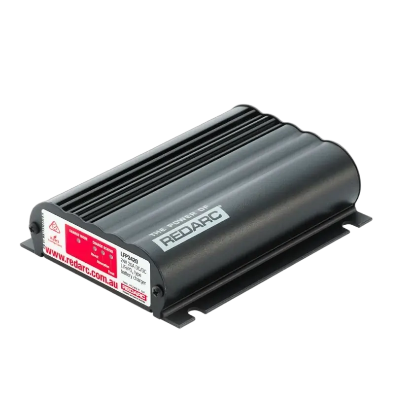 The REDARC LFP2420 In-vehicle battery charger is a 24 Volt 20 Amp, three stage DC DC charger that operates from a vehicle input between 9 and 32 Volts DC. It is designed to charge Lithium Iron Phosphate (LiFeP04) batteries to their optimal level with chemistry specific battery charging algorithms.