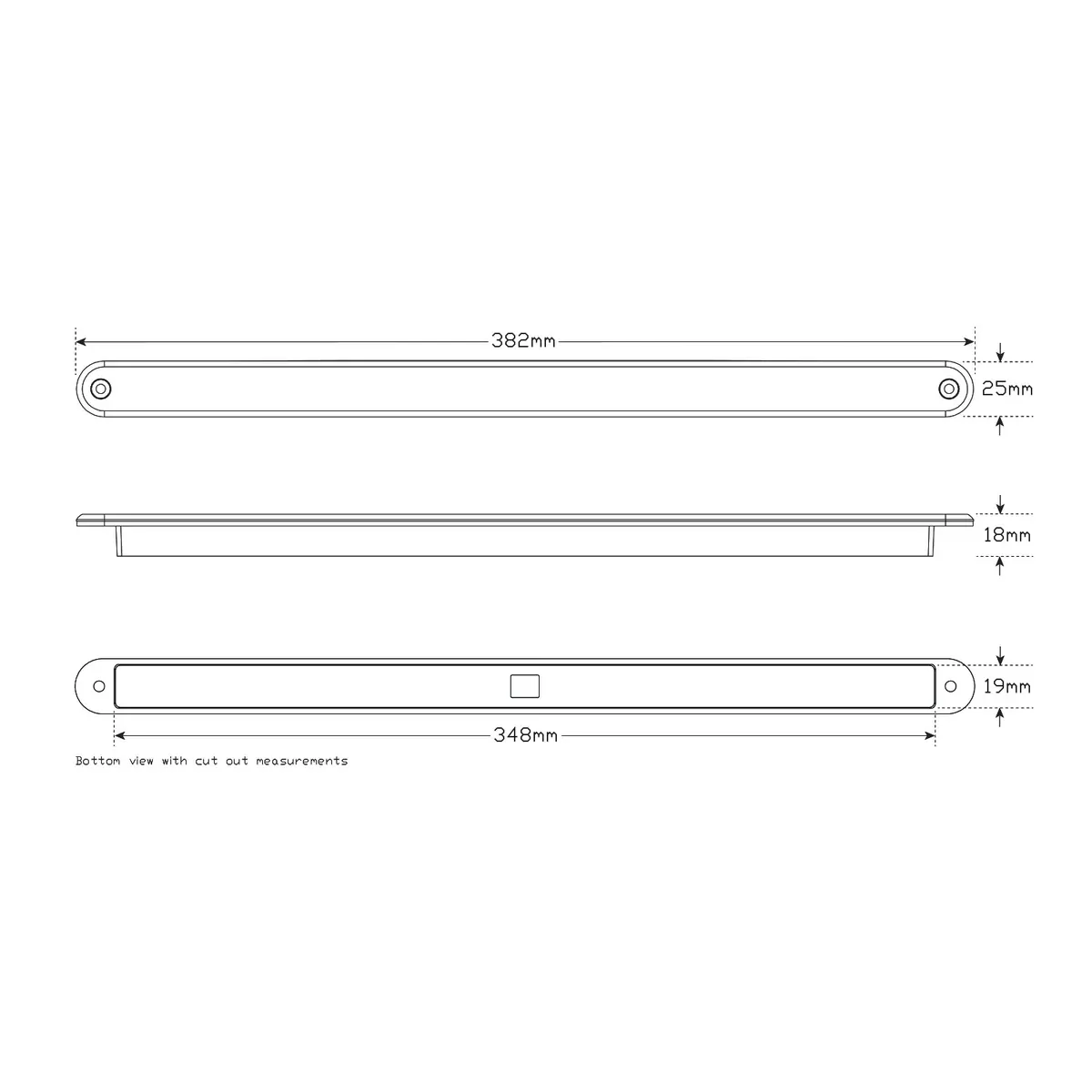 Mount onto flat surface horizontally. Push lamp and grommet into cutout (cut out 340mm x 19mm) in mounting surface, run wires through back and fix with screws supplied at both ends. Please refer to ADR13/00 for mounting instructions.