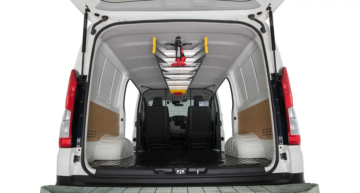 - Front and rear lower height adjustable sections of the ladder carriers can be pivoted up towards the roof when not being used to increase clearance within the van