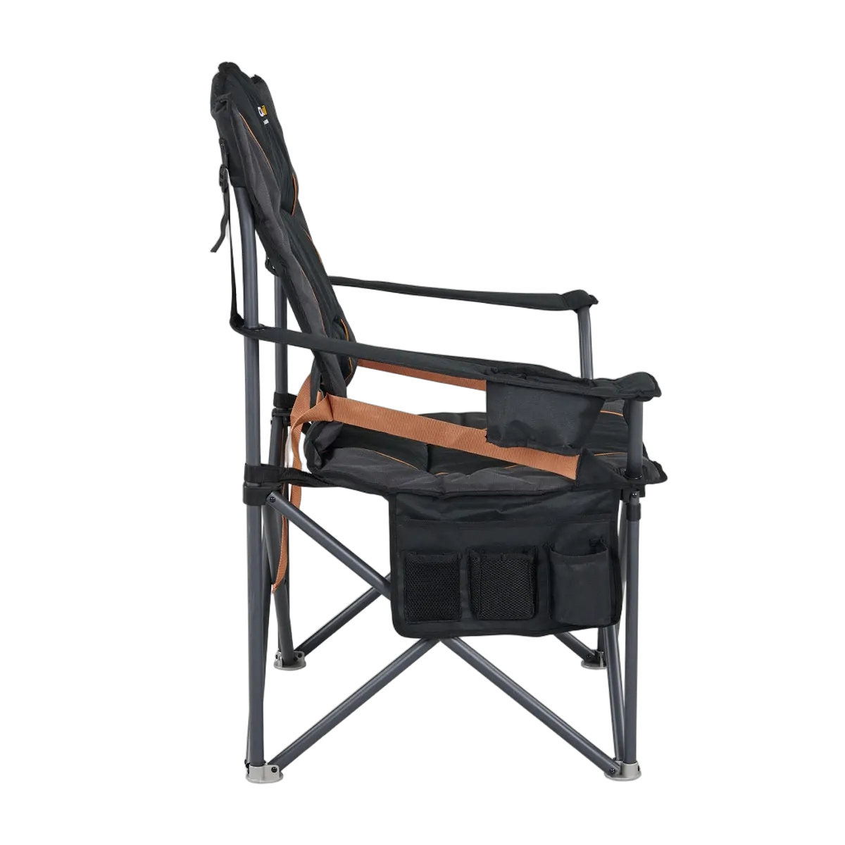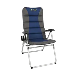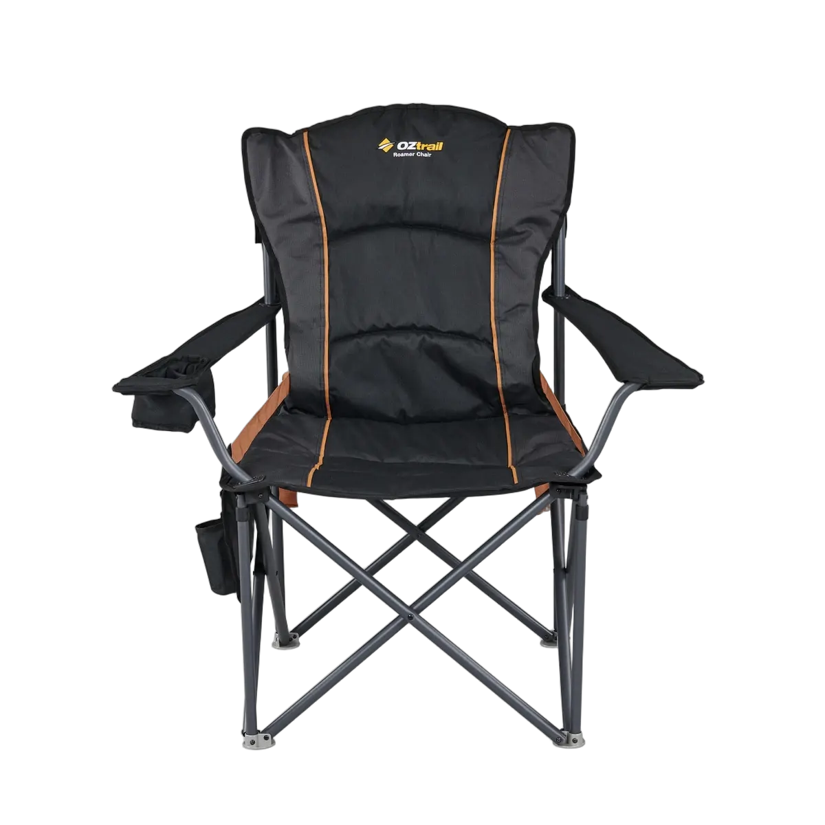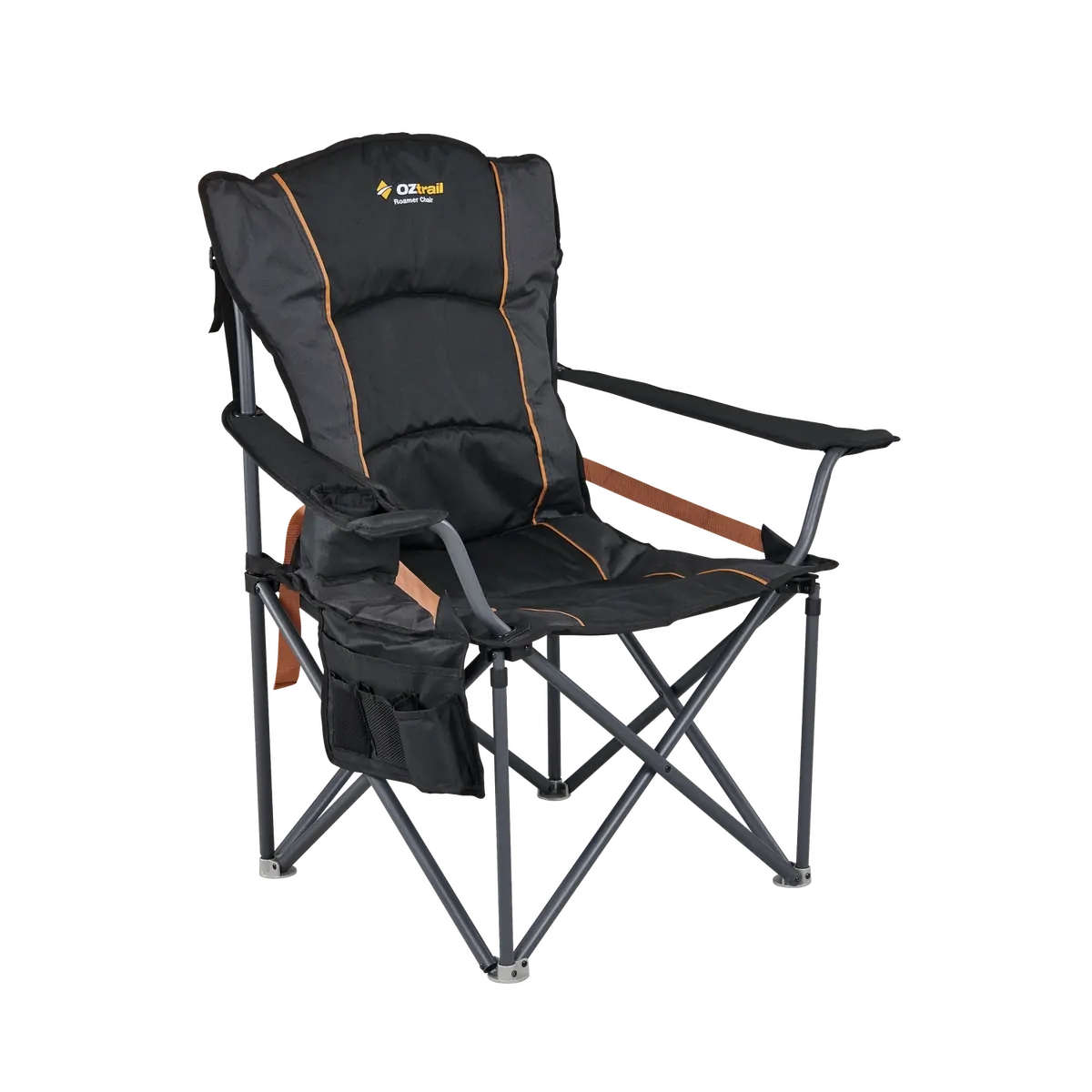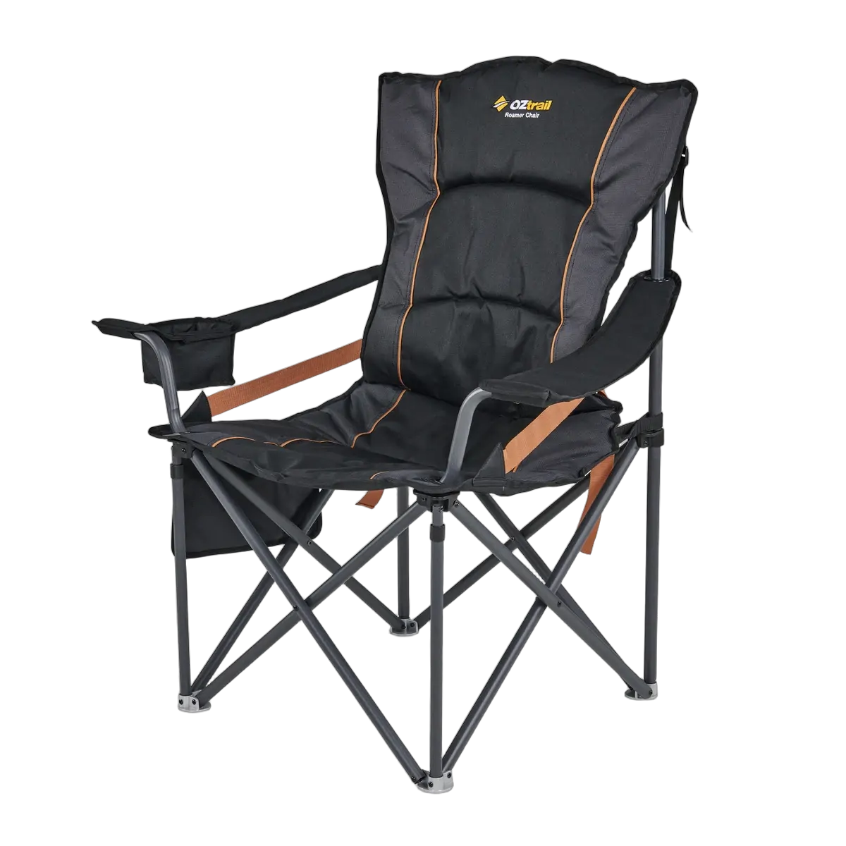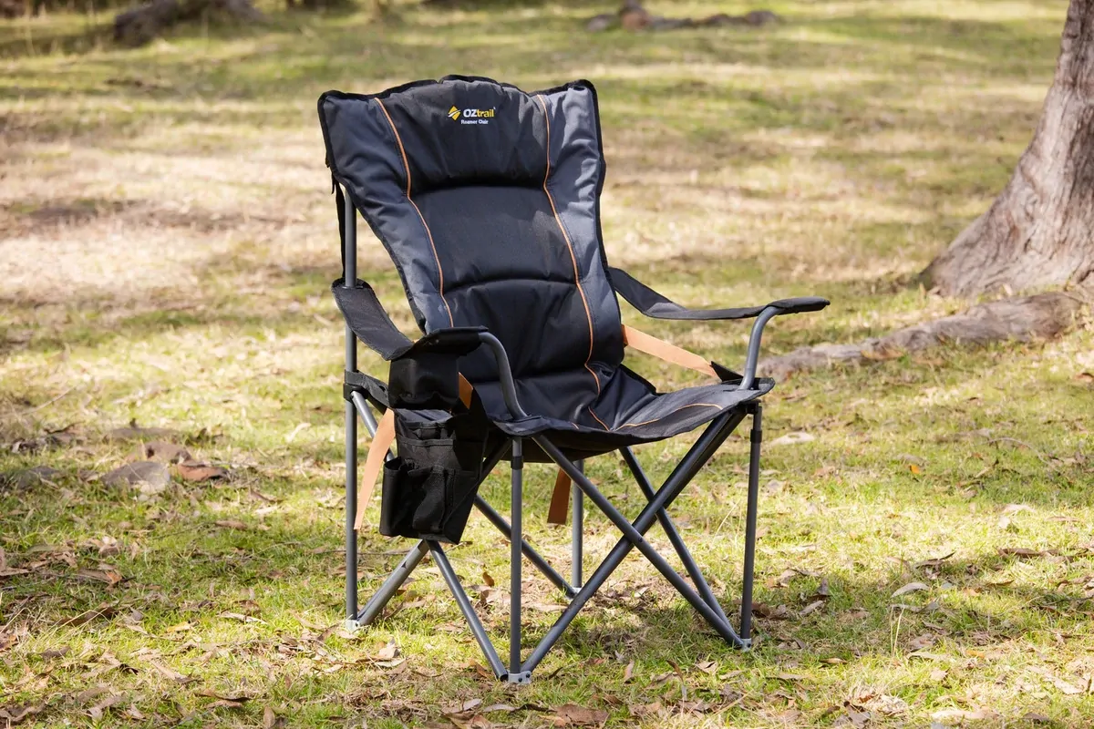 The Oztrail Roamer Chair offers comfort and durability with a heavy-duty 22mm steel frame, padded seat and backrest, and lumbar support. Ideal for outdoor use.