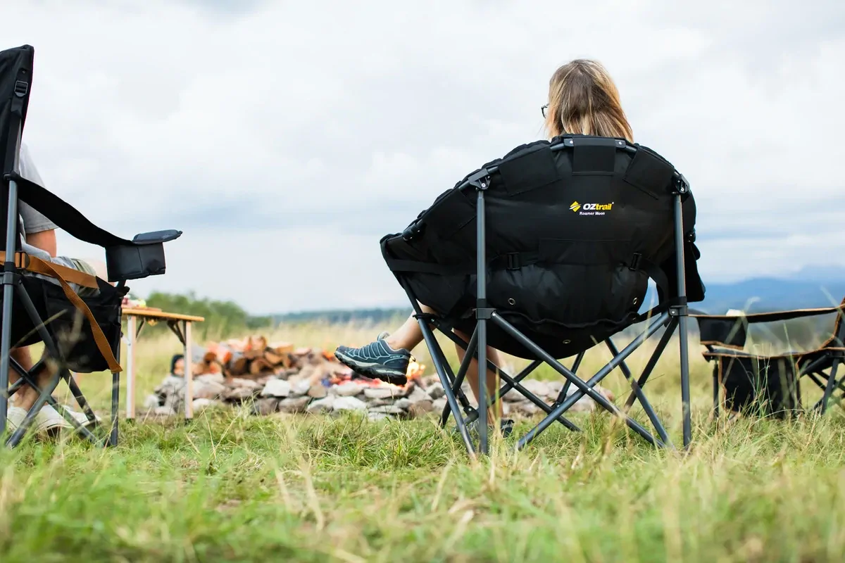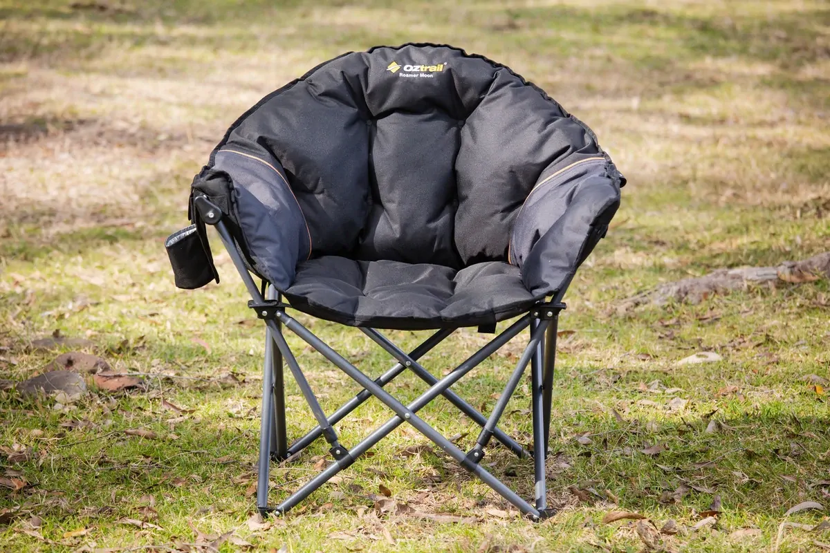 The Roamer Moon Chair features a cosy, padded moon shape with a 22mm steel frame and lumbar support, providing comfort for long outdoor sessions.